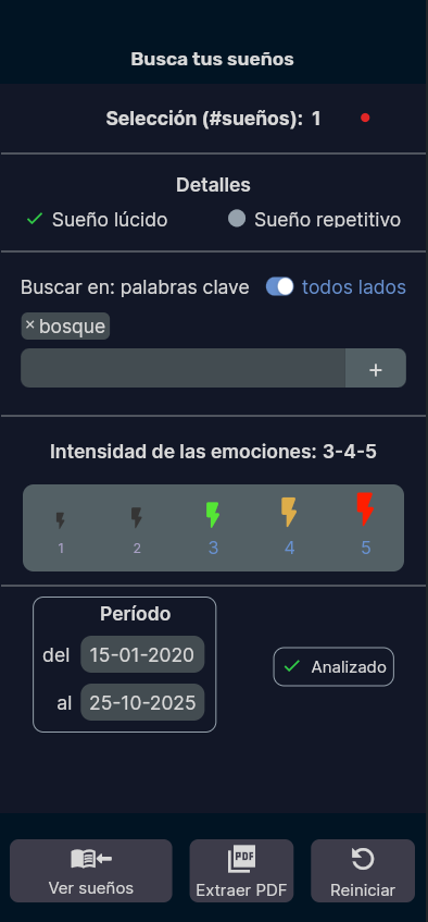 Explora tu diario de sueños y encuentra fácilmente un sueño específico gracias a nuestro motor de búsqueda avanzado, que te permite filtrar por palabras clave, fechas, emociones o temas.