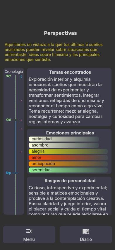 Descubre también un resumen de las facetas de tu personalidad reveladas por tus últimos sueños, las principales emociones experimentadas y los temas principales encontrados.