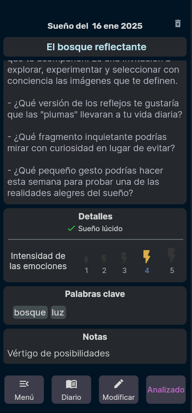 Ya sea que recuerdes tus sueños cada mañana con una claridad notable o solo de vez en cuando, esta aplicación está diseñada para adaptarse a tu relación única con tus sueños.